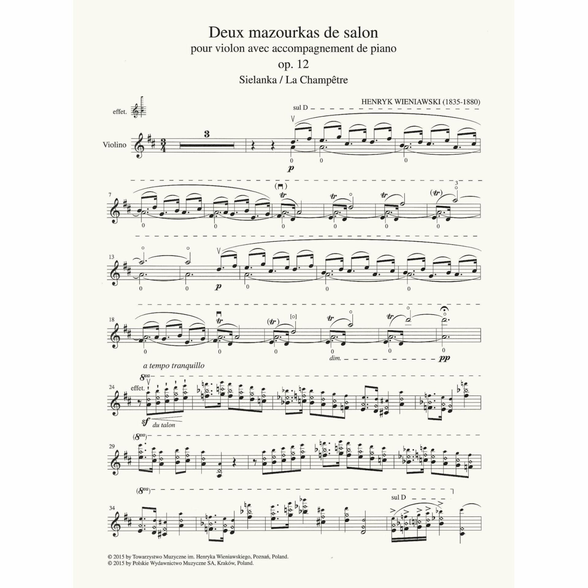2 Mazurkas de Salon: Sielanka (La Champetre) and Piesn polska (Chanson polonaise) for violin and piano, op. 12.  Henryk Wieniawski.  Edited by Zofia Chechlinska and Jaroslaw Zolnierczyk.  Published by PWM Edition.