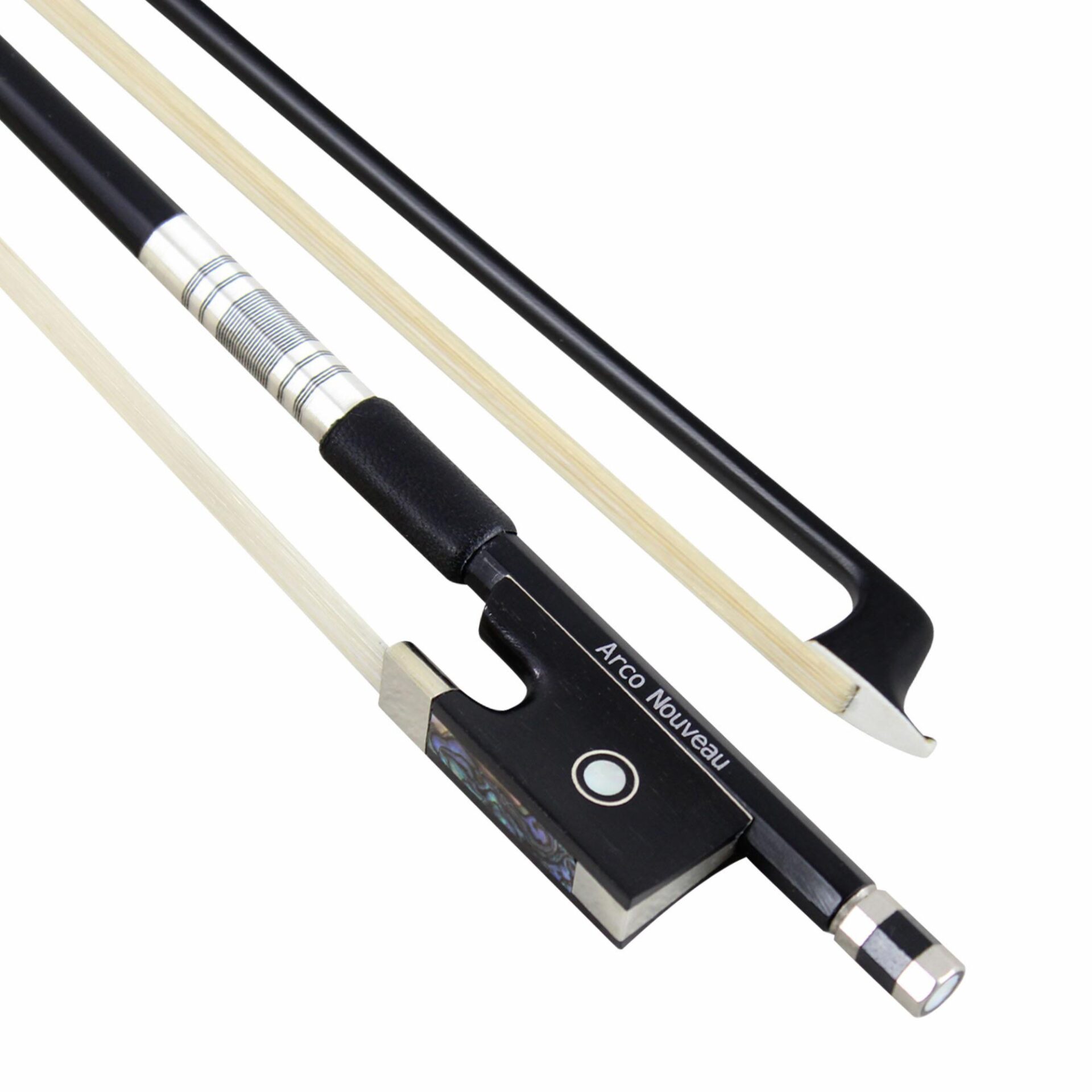 The Arco Nouveau has horsehair on a round carbon fiber stick, ebony frog fully mounted with nickel-silver, Parisian eye, three-part adjuster, and a thread and wire winding with leather grip. Stamped: Arco Nouveau