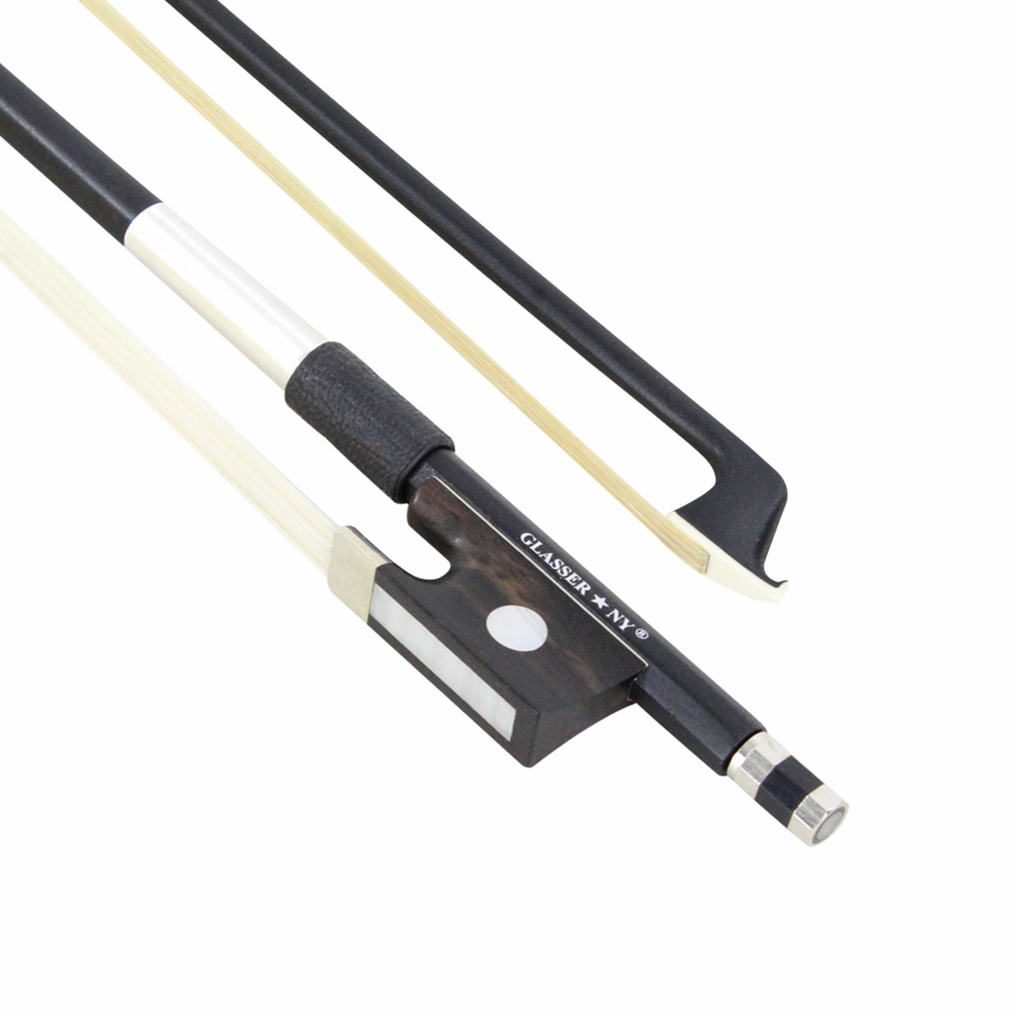 The Glasser X-Series carbon composite bows are great for students who seek the performance of a carbon fiber bow without the price tag that goes along with it. These round composite bows are mounted with a half-lined Paulus ebony frog, and have a faux pearl slide and eye. They have an imitation lizard grip with a nickel silver winding. Satin black finish.