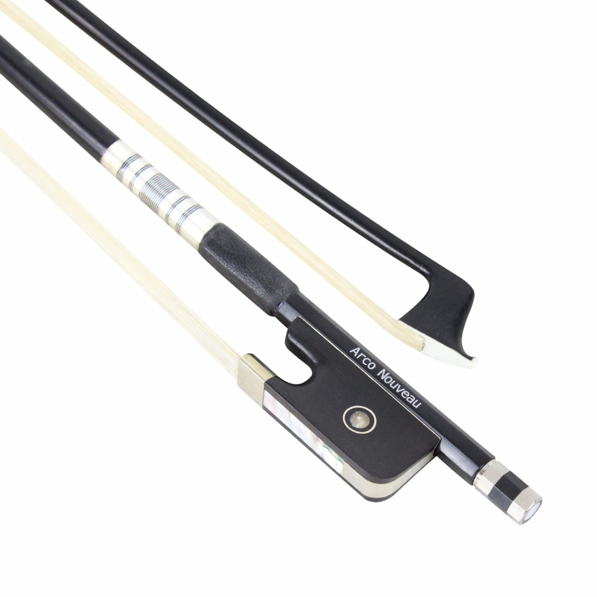 The Arco Nouveau has horsehair on a round carbon fiber stick, ebony frog fully mounted with nickel-silver, Parisian eye, three-part adjuster, and a thread and wire winding with leather grip. Stamped: Arco Nouveau