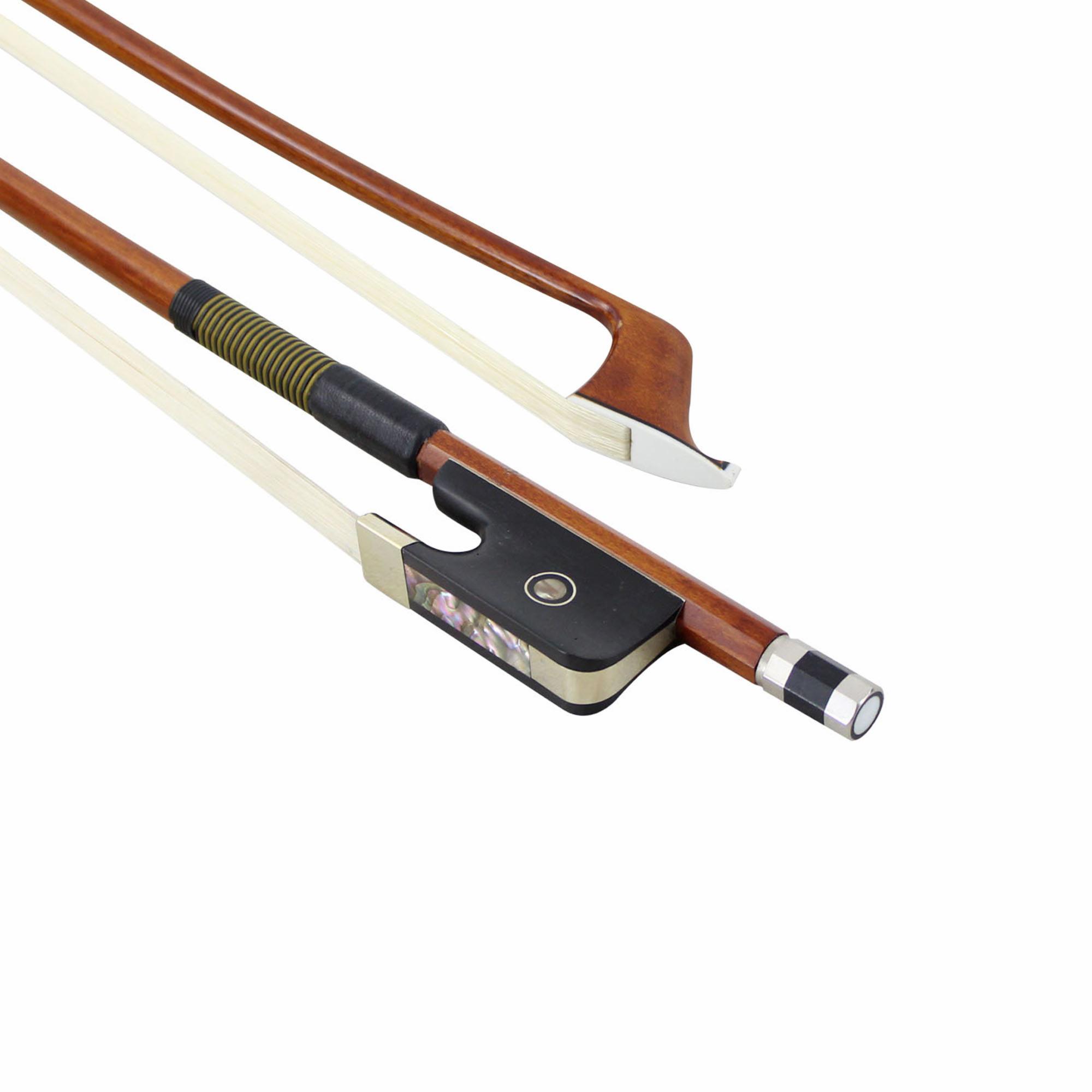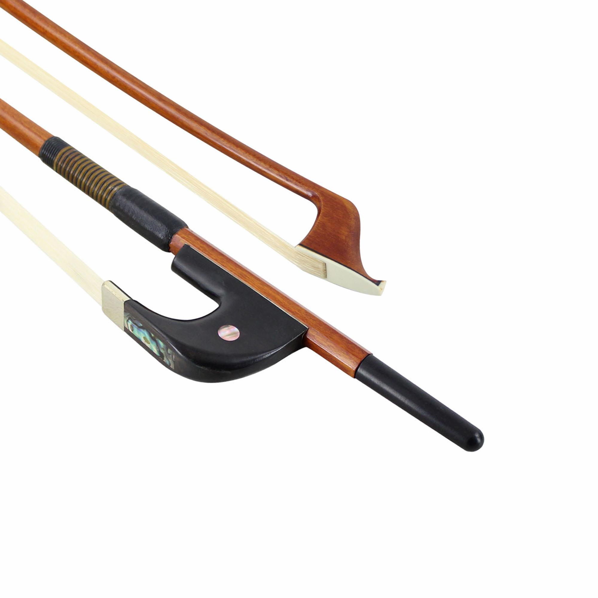 This well-balanced and inexpensive pernambuco bass bow is an excellent step up for the advancing player. Round pernambuco stick, quality Mongolian horse hair, faux whalebone winding, and leather grip.