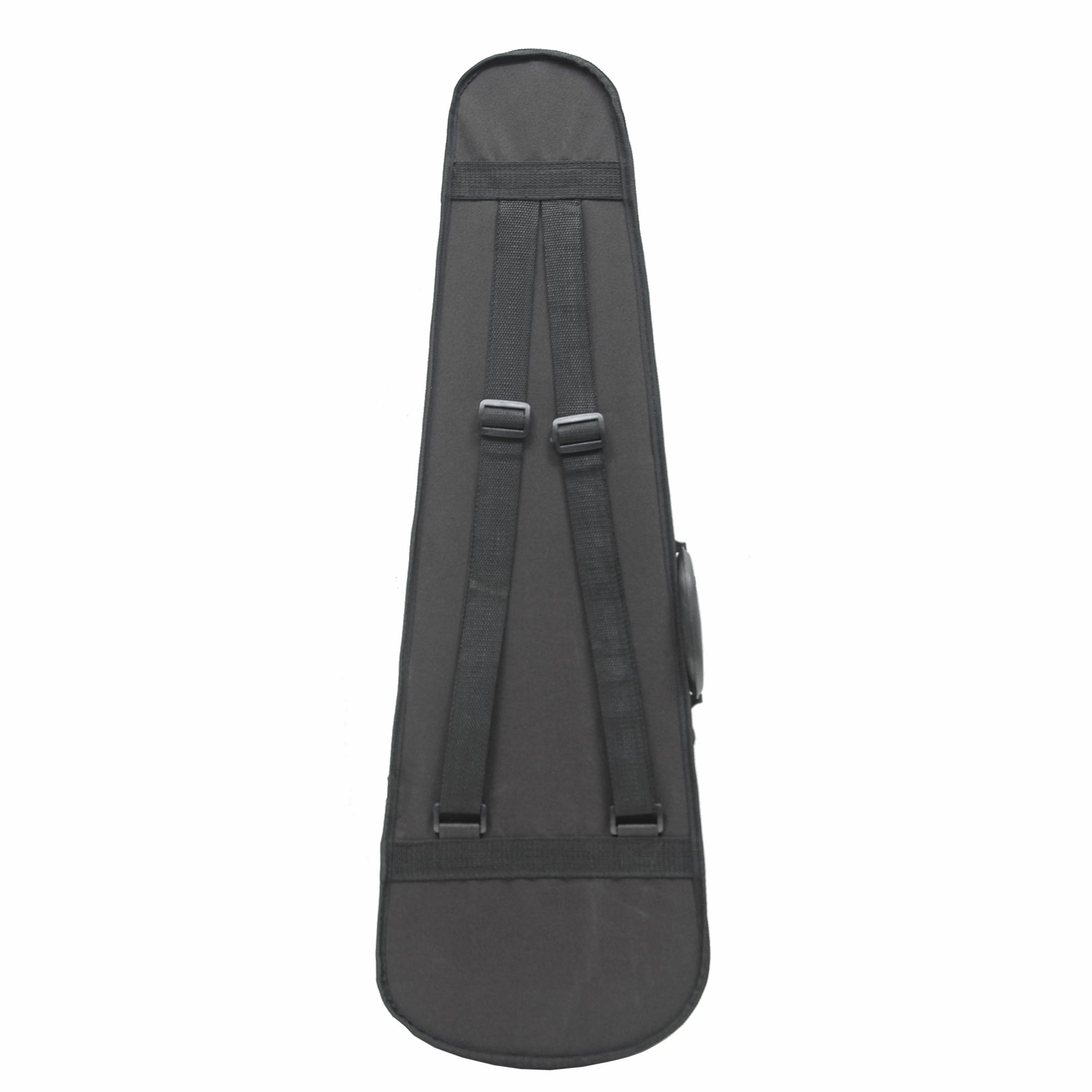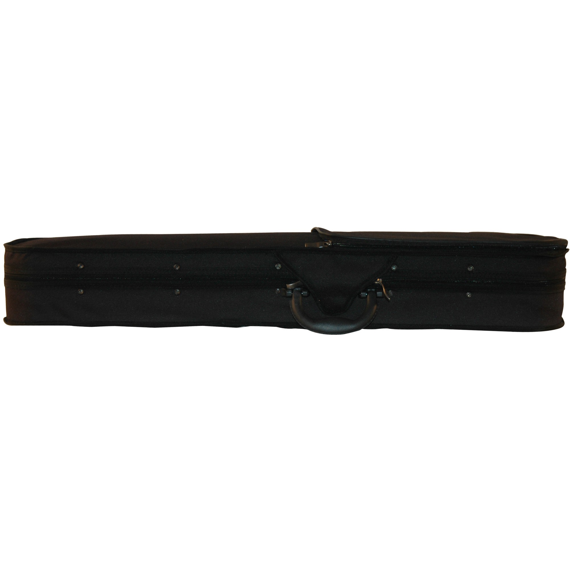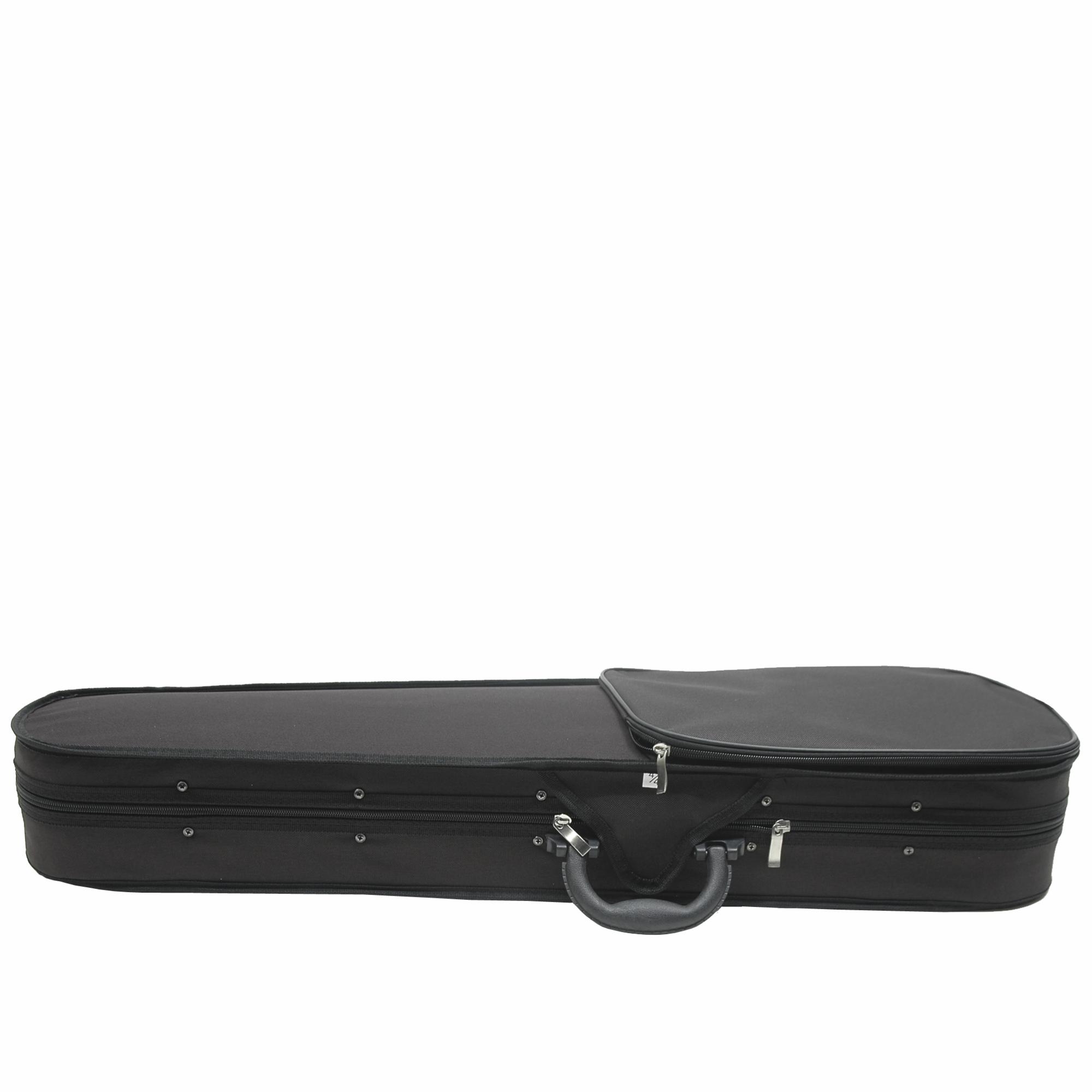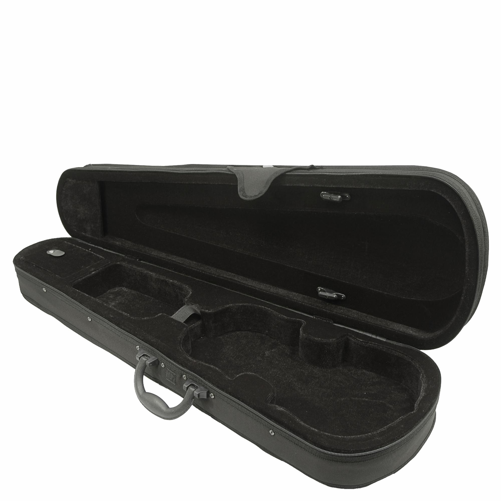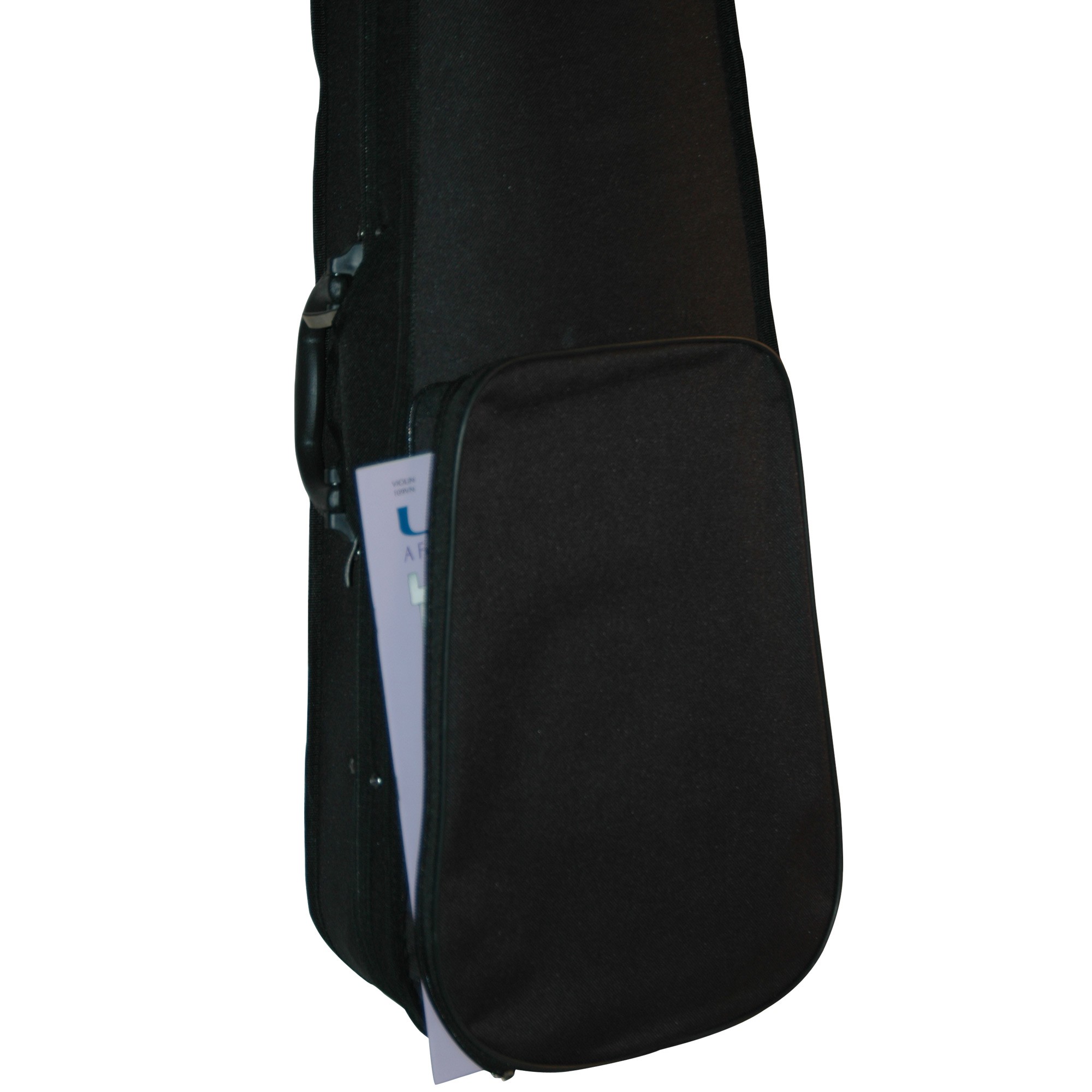 The Prelude violin case has a traditional shape that is constructed of a light weight Styrofoam shell. This case has a black nylon exterior with a zipper closure, an accessory pocket, a side carrying handle and two attached straps for backpack carrying option.