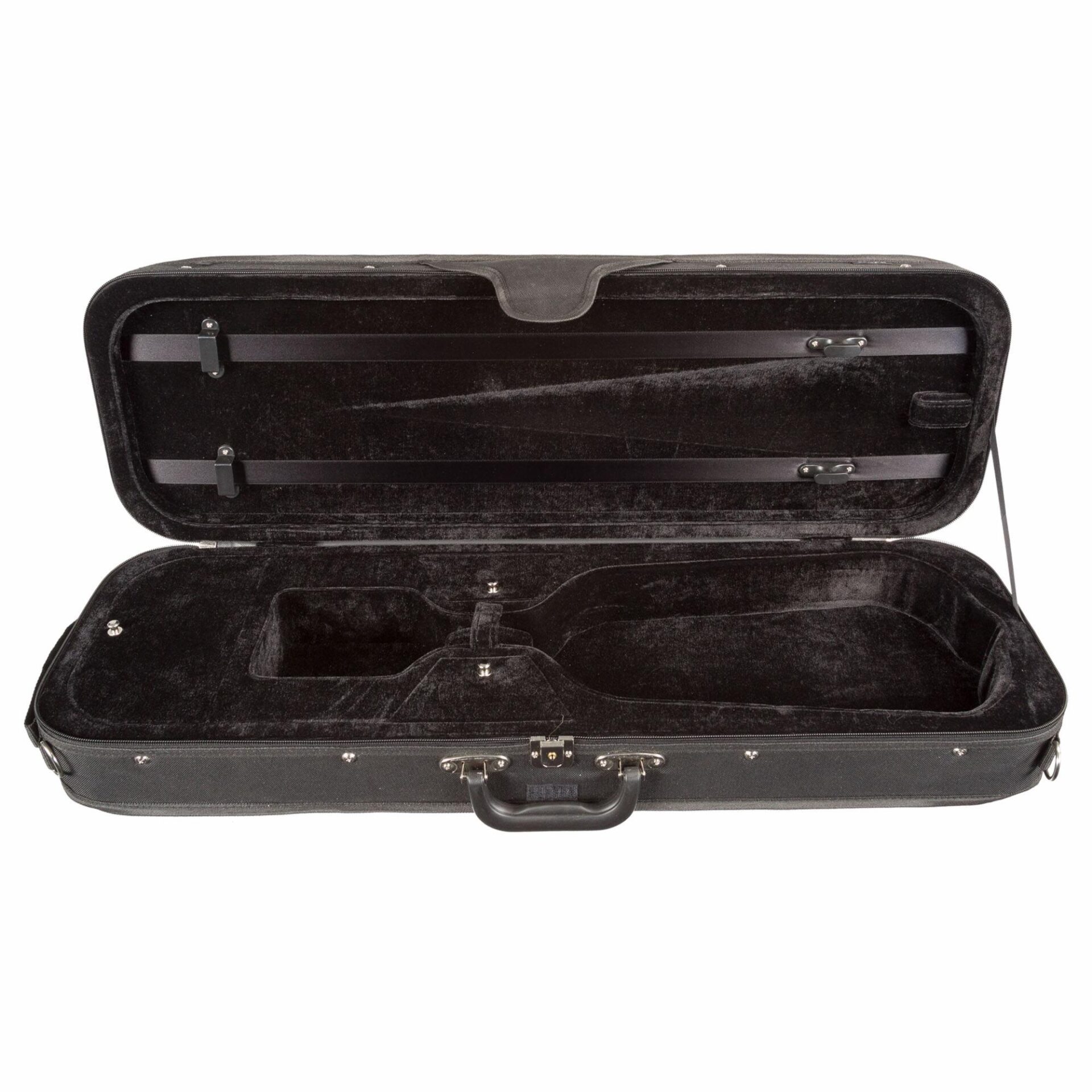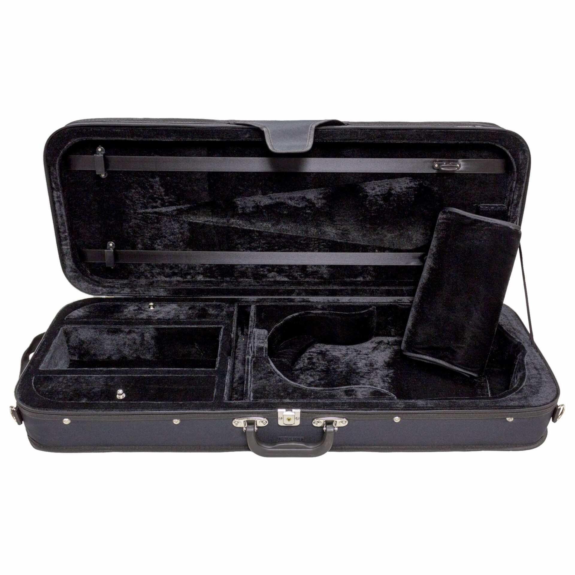 OX399 Oxford oblong violin or viola case is a popular entry level case. Black nylon screw attached cover with latch flap and music pocket. Plush-lined black interior with three accessory pockets and two Hill-style bowholders. Includes instrument blanket and shoulder strap. Zipper closure.