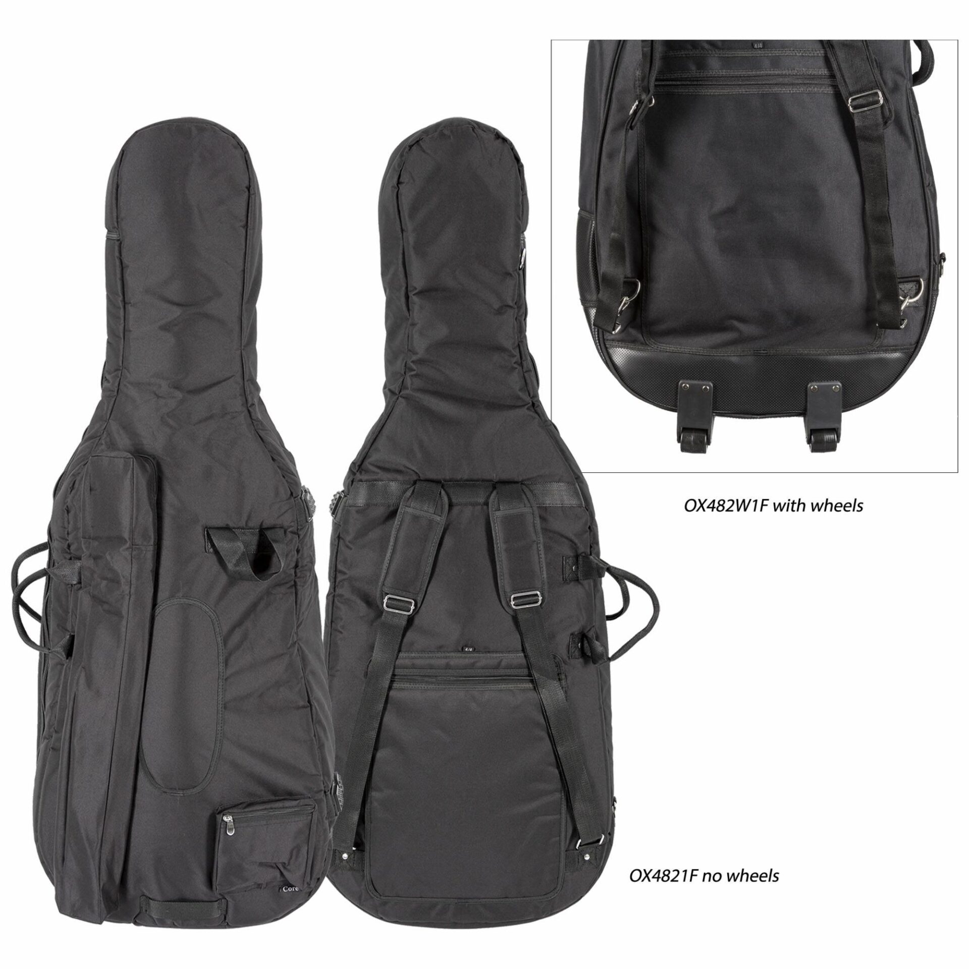 The Oxford OX482 cello cover features 12mm of heavy padding, a water resistant cordura cover, bow sleeve, and backpack straps.