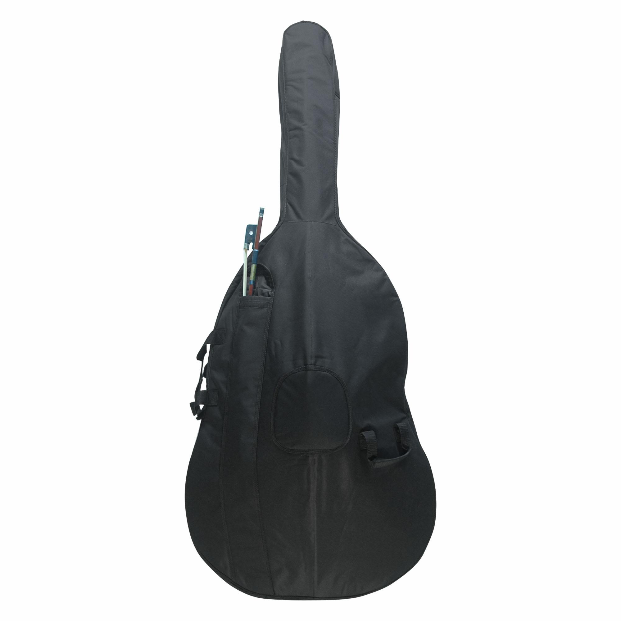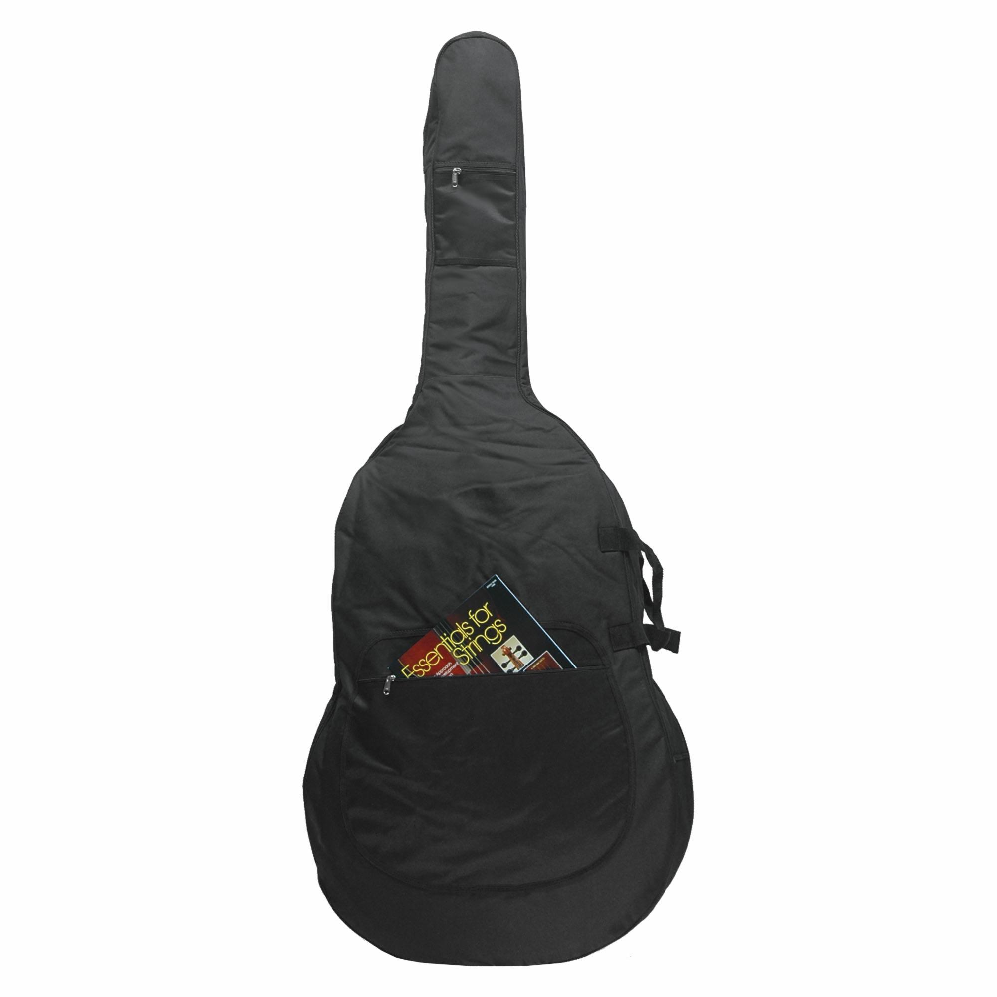 The Oxford bass cover fastens with a double zipper closure, has one exterior bow pocket with Velcro closure, a small zippered accessory pocket, and a large zippered music pocket.  The Oxford bass bag has multiple carrying handles, two D-rings, and includes one shoulder strap.
