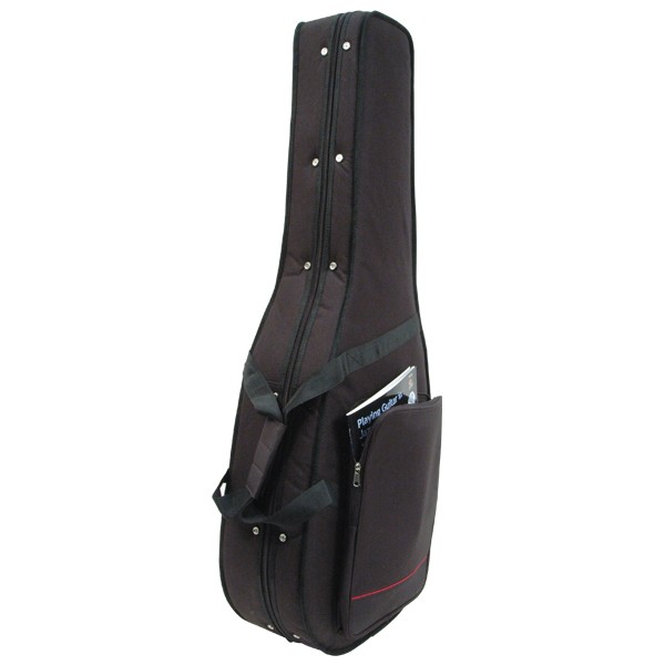 Exterior: Guitar form.  18″ x 44″ x 7″.  5.4 lbs.  Black cordura over thin padding and polyfoam frame.  Fastens with zipper.  Large music pocket with zipper.  Two side handles.  D-rings for backpack straps (included).  Stitched piping.