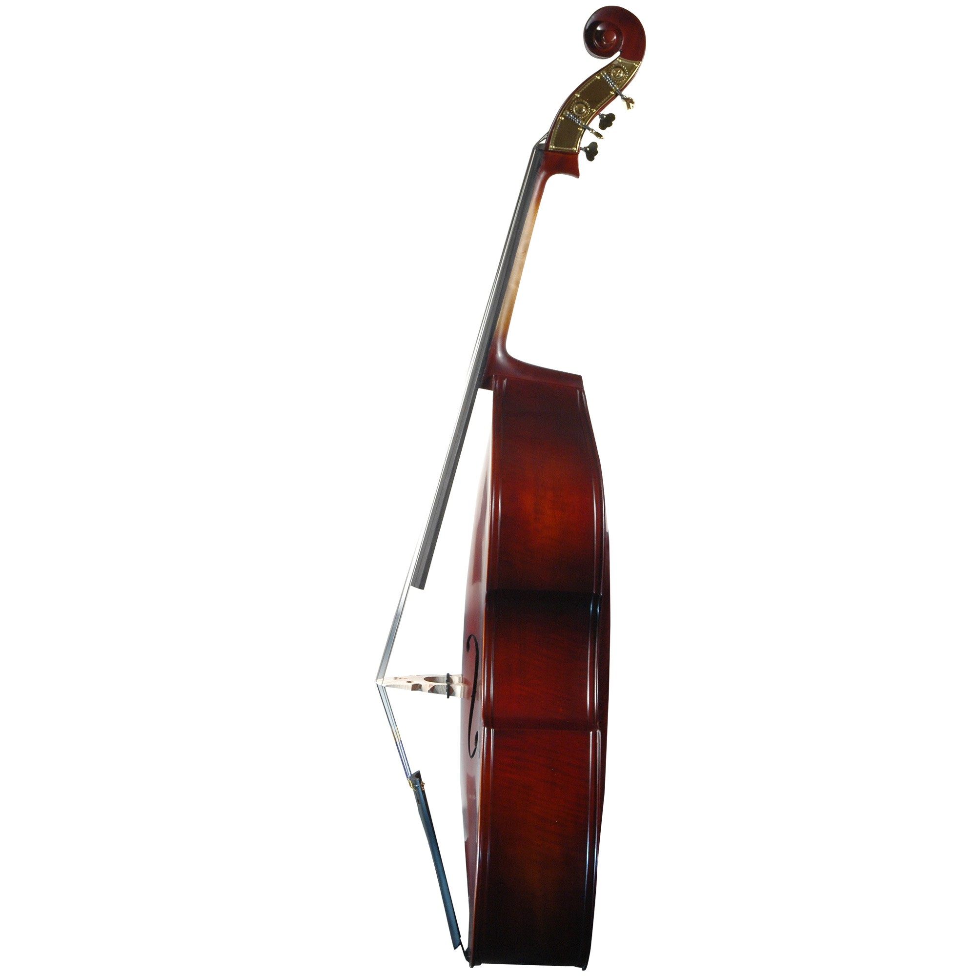 The Hans Kroger bass is constructed from solid spruce top of defined, medium grain. Inlaid purfling. Two piece, arched laminated back, light flame. Ribs slightly figured. Plain scroll. Finished in a spirit varnish of reddish-brown, shaded down to a golden ground. Outfit includes Pop’s bass rosin, case, and your choice of bow and frog. Made in China.