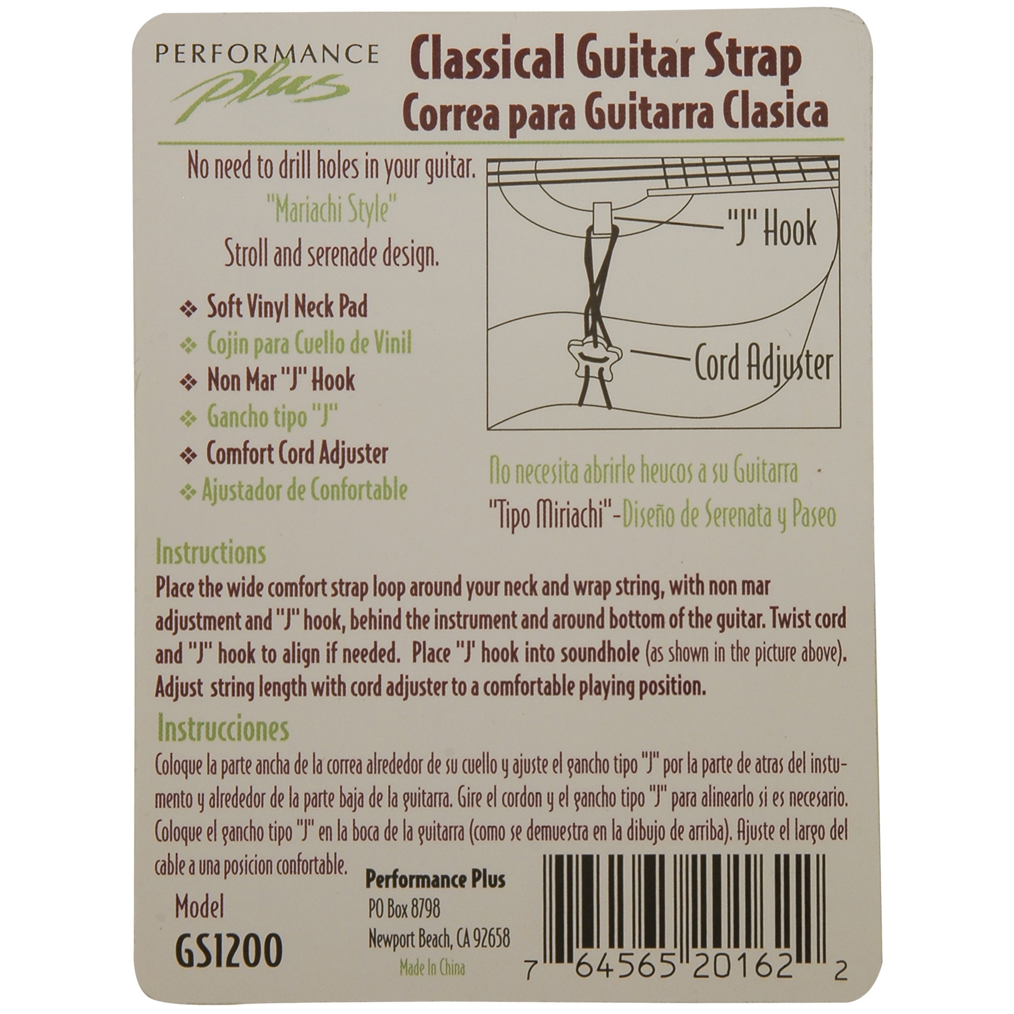 Plastic U-clip holds instrument in place. Two string pulls, adjust strap to any desired length. Fits around neck. Made of vinyl.